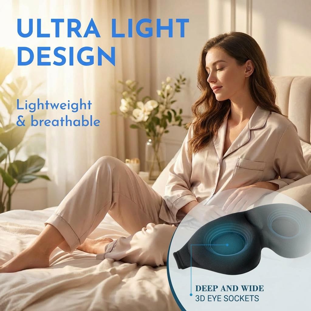 The Comferra Sleep Mask gently blocks light while relieving facial pressure, helping your body relax naturally so you can fall asleep quicker and wake up truly refreshed — no tight straps, no irritation, just pure comfort.